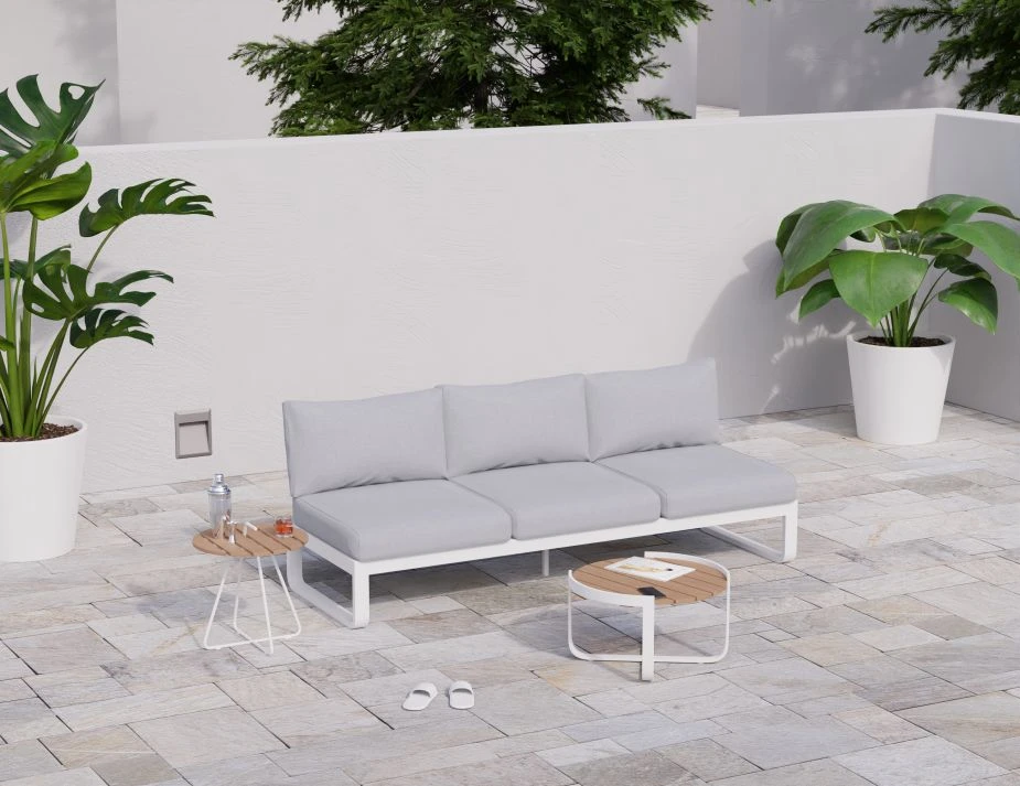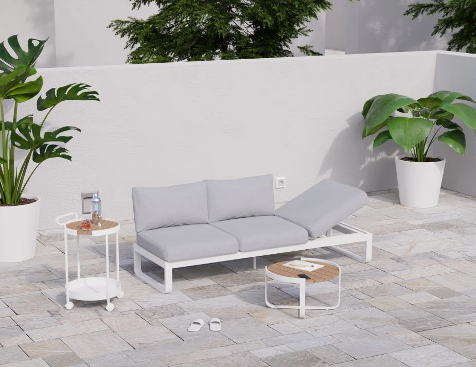Measuring W: 207cm x H: 80cm (w/backrest) x D: 70cm, this sunlounge is designed to comfortably seat up to three people. The powder-coated aluminum frame in a trendy matt white finish ensures durability and resistance to wear and tear, making it perfect for outdoor use. The light grey cushions made of polyester texteline outdoor fabric are both comfortable and practical, providing a cozy seating experience while being easy to clean and maintain. Its sleek and modern design adds a touch of sophistication to any space while providing practical seating options. Use it in outdoor patios, waiting areas or break rooms, and create a comfortable and stylish seating area that fits your specific needs. The Fino Outdoor 3-Seater Sunlounge in Matt White Frame / Light Grey Fabric is sure to impress your guests while providing them with a comfortable and stylish seating option that will last for years to come. Its durable and versatile design makes it an ideal choice for any office or commercial space looking for functional and attractive outdoor seating solutions.