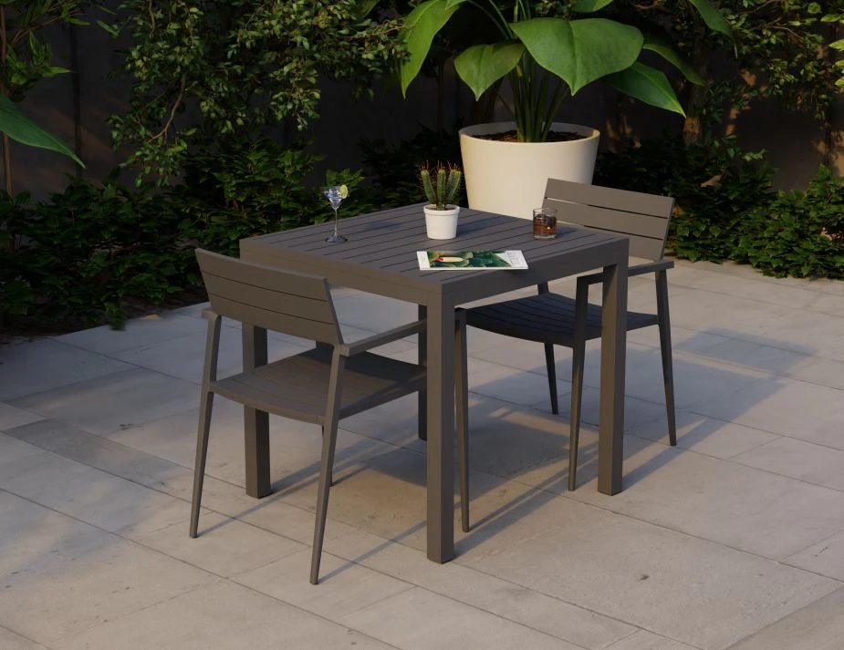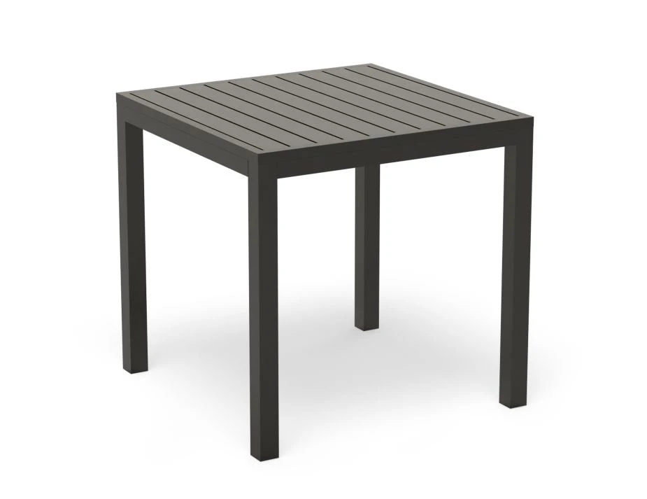 The Halki Table Matt Charcoal Aluminum is a sleek and modern outdoor table designed for commercial outfitting in hotels, restaurants, and other commercial spaces.