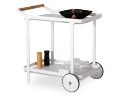 Width : 78.5cm, Depth : 50cm, Height : 82cm, Timber Handle : FSC Certified Teak, Colour : Matt White, Frame : Aluminium powdercoated, Color : Matt White, Wheels : Rubber Edged, Designer : Bent Design Studio