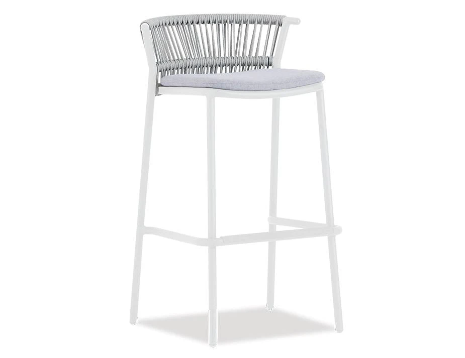 Seat Height: 75cm H, Seat Size: 40cm W x 36cm D, Frame Colour & Material: Matt White Aluminium Powdercoated, Cushion Material : Light Grey Textilene Fabric, Rope Colour : Light Grey, Foot Protector: Nylon Slides, Designer: Bent Design Studio, Assembly: None