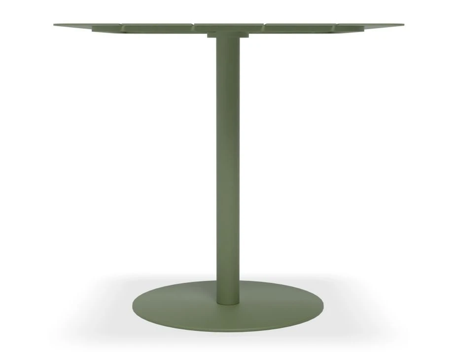 The frame of the table is made from durable and lightweight aluminum with a matte green powder coat finish that is resistant to weather and corrosion. The adjustable nylon glides on the feet of the table protect the surface underneath and provide stability on uneven surfaces. This cafe table is designed by the renowned Bent Design Studio, ensuring a high level of quality and style for commercial outfitters, interior designers, and architects.
