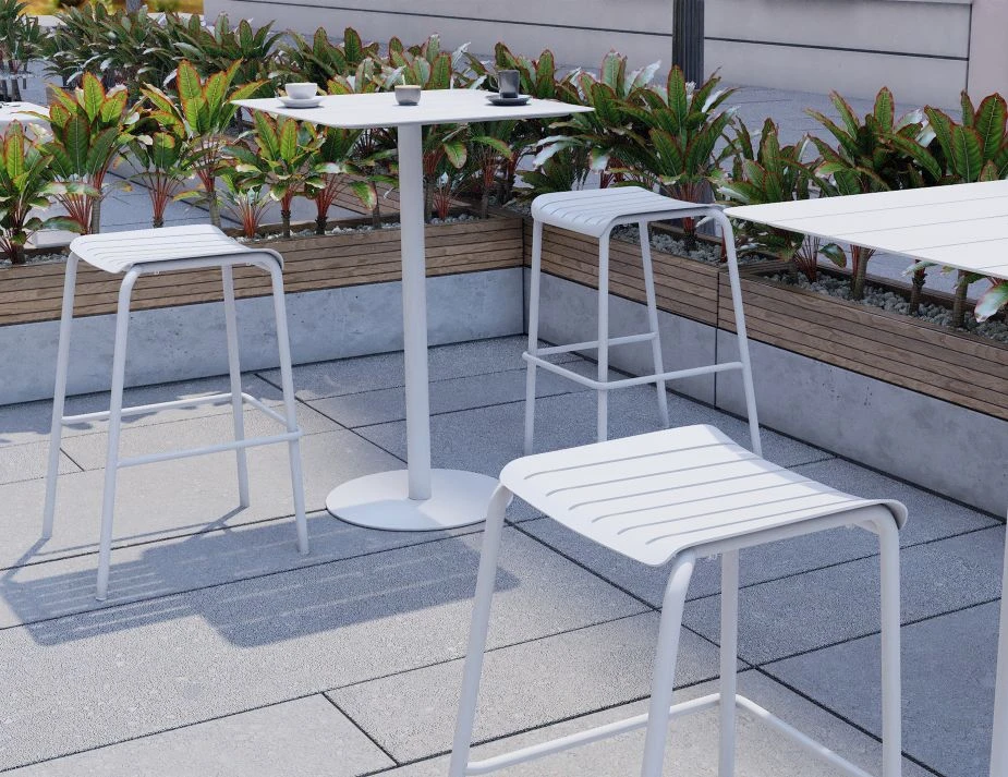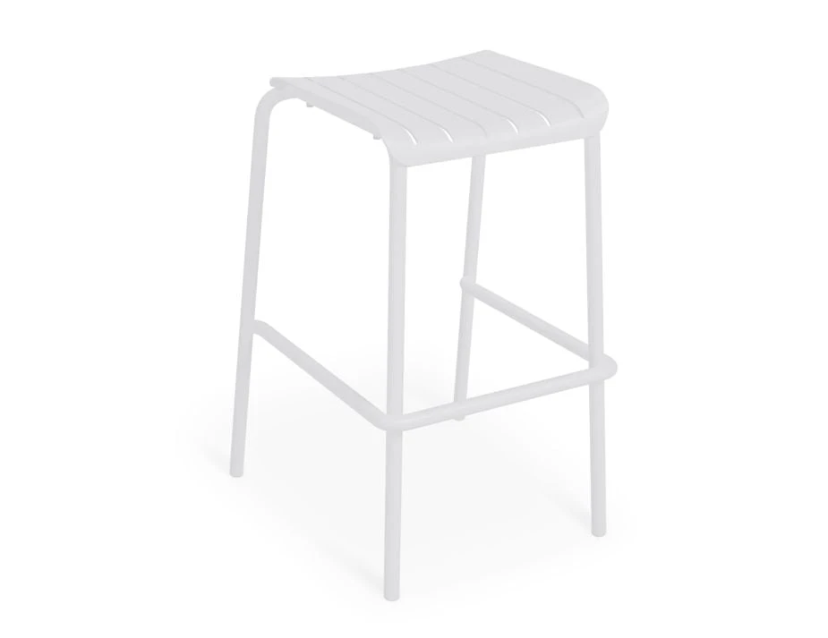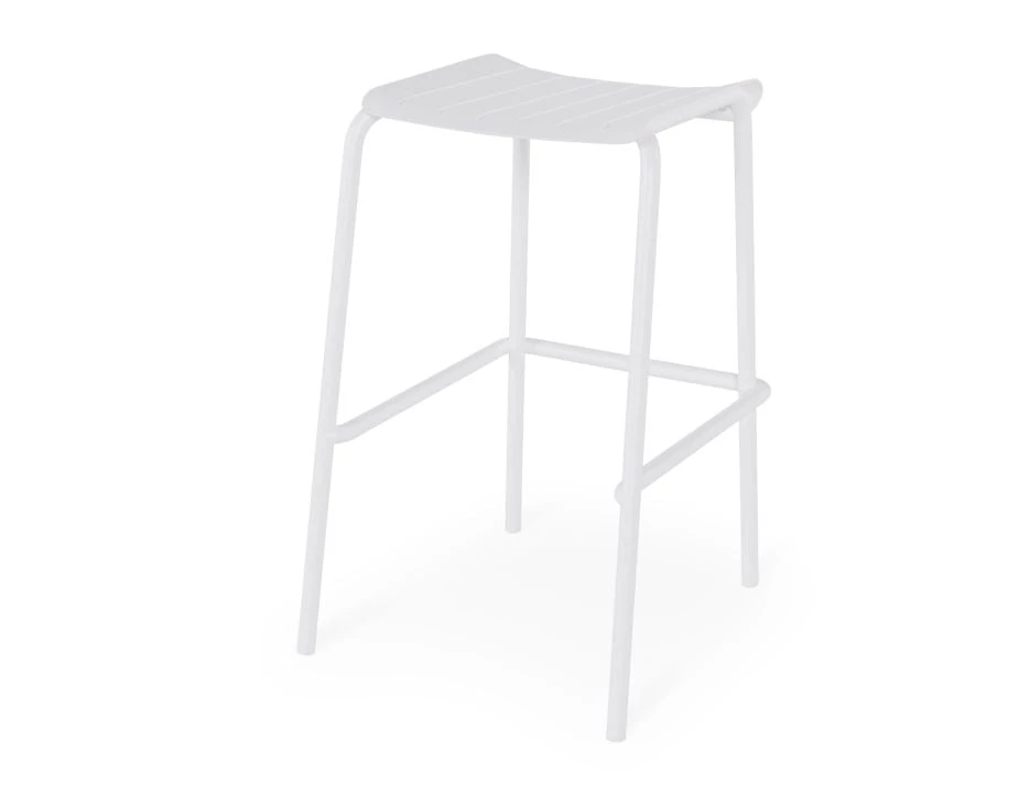 The seat height of 75.5cm makes it comfortable for guests to sit and enjoy their drinks and meals, while the footrest height of 32cm provides additional support and comfort. The frame of the stool is constructed from durable, powder-coated aluminum that is available in a sleek matt white finish.Additionally, the Roku Outdoor Backless Bar Stool is easy to maintain, thanks to its powder-coated finish and lightweight design. The stool weighs only ~3.2Kg, making it easy to move and reposition as needed. The nylon slides on the feet protect your floors and prevent the stool from sliding around, ensuring a stable and safe seating experience. This bar stool is part of the Roku Outdoor Furniture collection, offering a range of coordinating pieces to complete your outdoor space. With its modern design, high-quality construction, and versatility, the Roku Outdoor Backless Bar Stool is an excellent choice for any commercial project manager, interior designer, or furniture outfitters company.