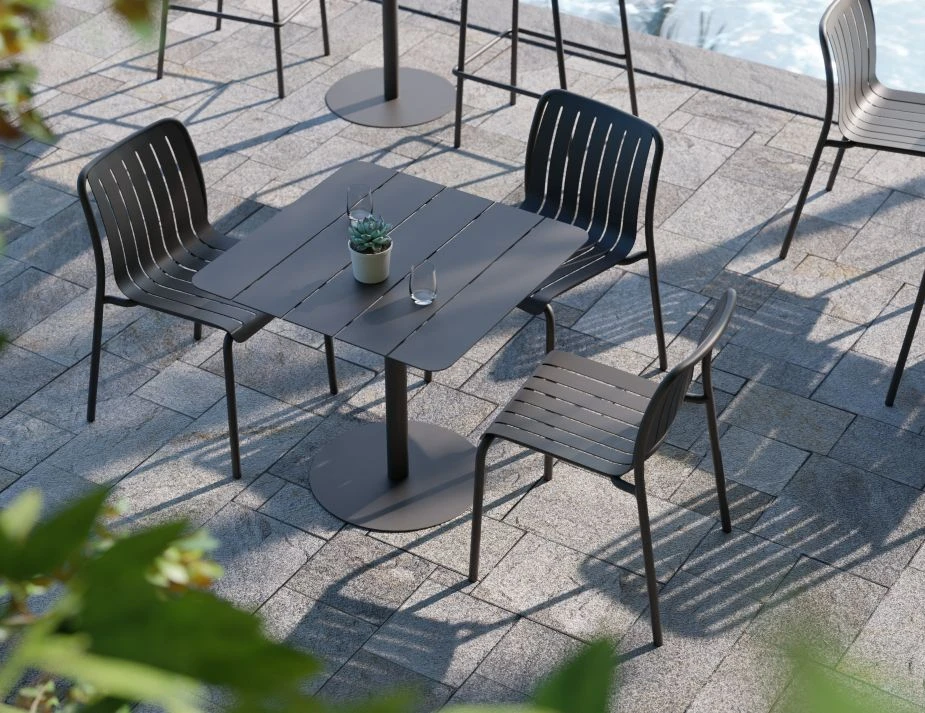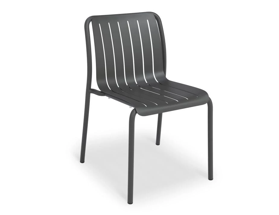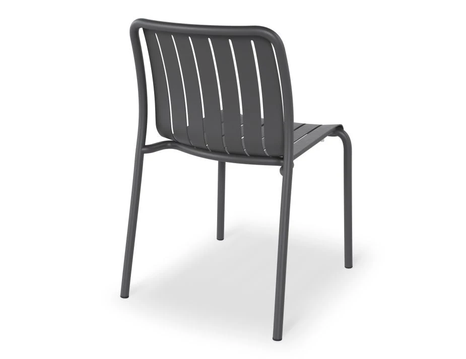 The frame of the chair is crafted from durable powder coated aluminum and is finished in a stylish Matt Charcoal grey finish that is both eye-catching and weather resistant. The chair’s seat measures 52.5cm wide by 80cm high by 52.5cm deep, providing ample space for guests to sit comfortably. The seat is supported by nylon slides, which act as foot protectors and help to preserve the longevity of the chair.