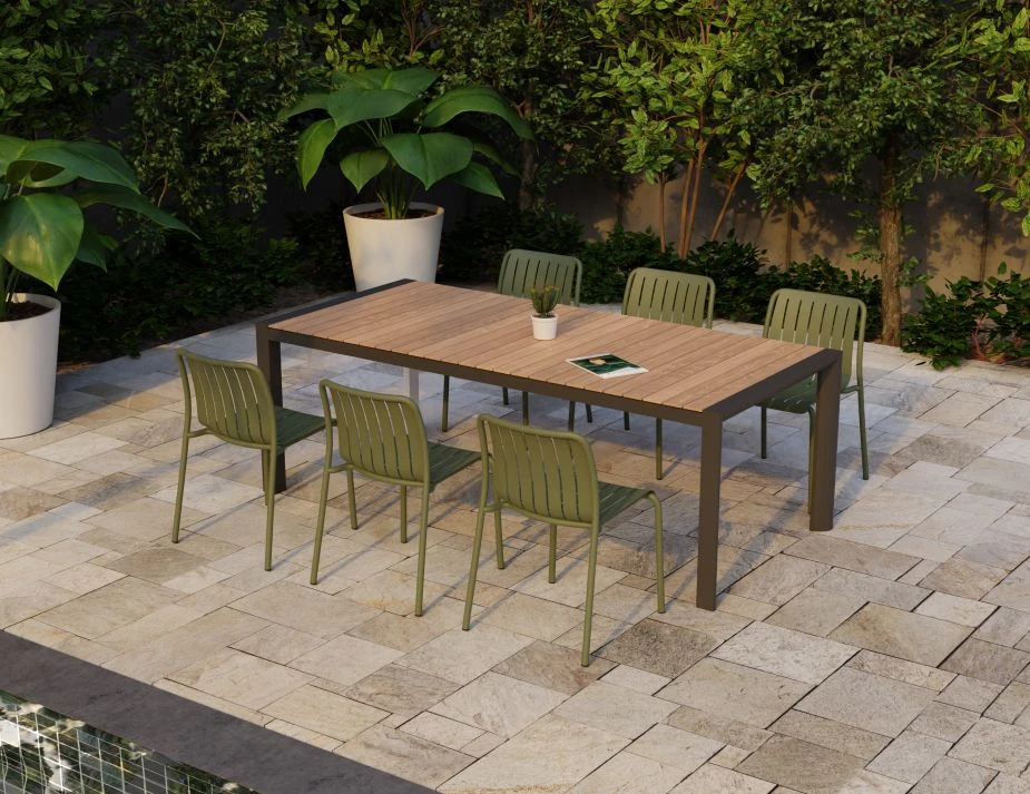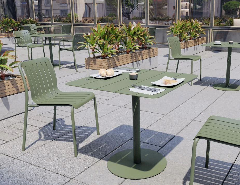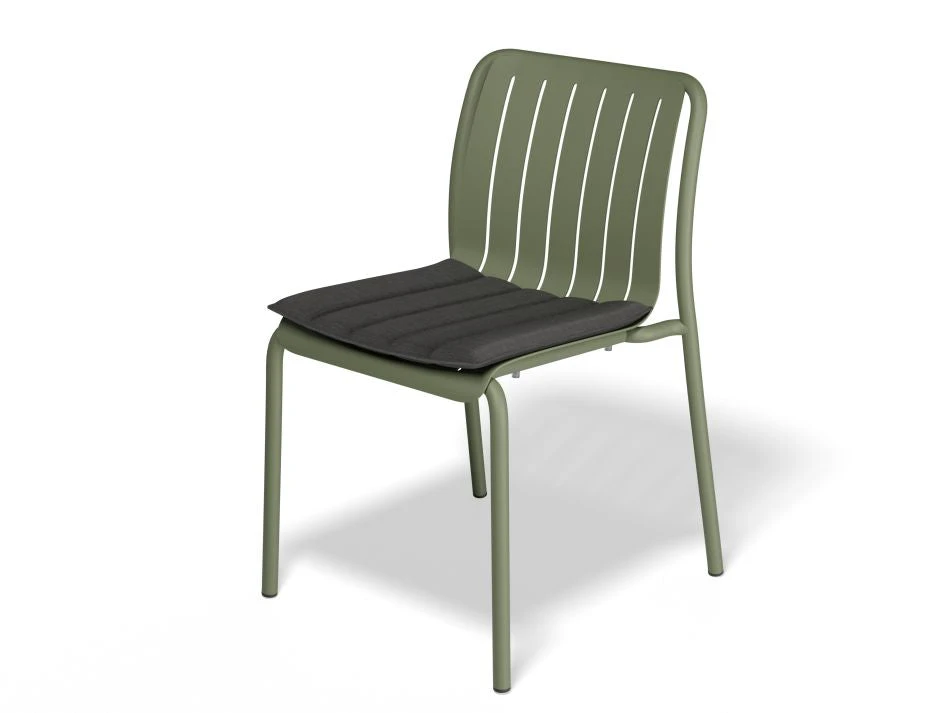The overall size of 55.5cm W x 80cm H x 52.5cm D, combined with the durable, powder coated Matt Green Aluminum frame, makes this chair both stylish, study and stackable. The addition of nylon slides as a foot protector adds to the overall durability of the chair. Designed by the renowned Bent Design Studio, this outdoor dining chair is part of the Roku outdoor furniture range.